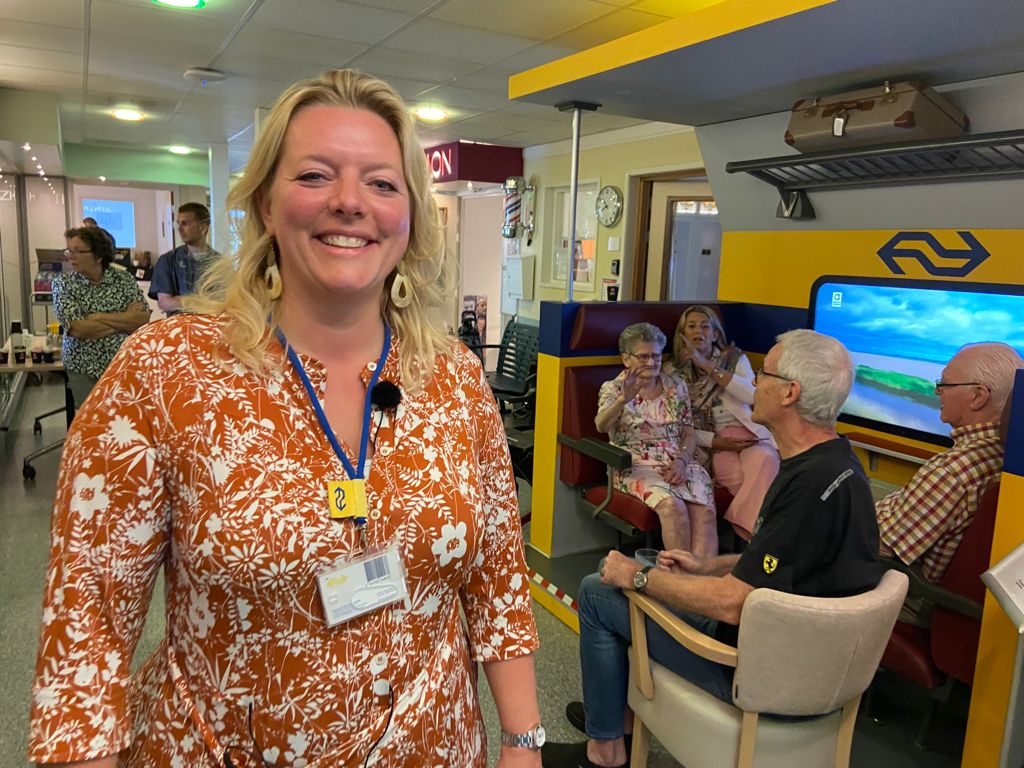 Kijkend uit het raam van de treincoupé glijdt het West-Brabantse landschap voorbij. ‘Het volgende station in Station Roosendaal’ klinkt het uit de speaker. Het is net alsof de trein echt over het spoor rijdt, maar in werkelijkheid zijn de bewoners met dementie van Heerma State in Roosendaal gewoon op reis in hun eigen woonzorgcentrum. Dat kan sinds donderdag in de speciale ‘Hoofdreiscoupé’ die is bedacht door de NS en Alzheimer Nederland.