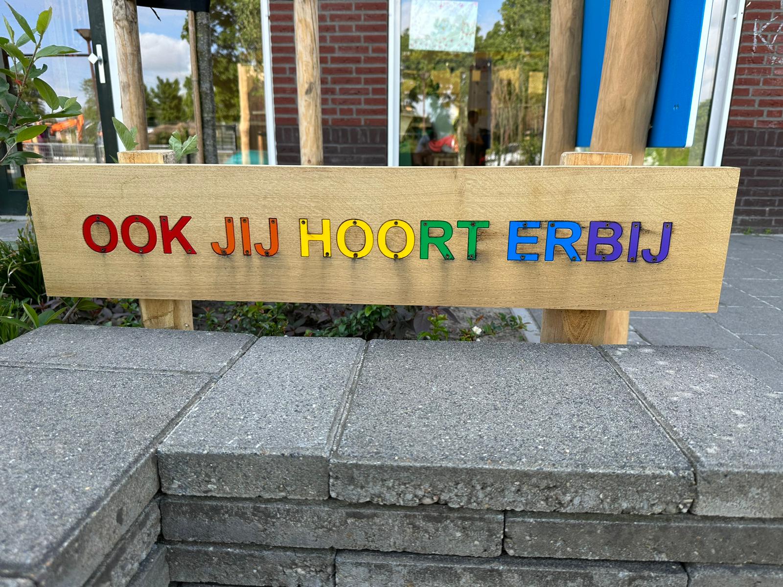 De speelplaats is voor iedereen. Dit is ook te zien aan het bankje wat op de speelplaats staat met de tekst: ‘OOK JIJ HOORT ERBIJ’. Naomi uit groep 6 legt uit waar het bankje voor bedoeld is. “Als je je alleen of eenzaam voelt kun je op het bankje gaan zitten. Anderen kunnen dan zien dat je je alleen voelt en je uitnodigen om samen te spelen.” Het bankje is bedacht door de leerlingen zelf, zodat niemand buitengesloten kan worden tijdens het buitenspelen.