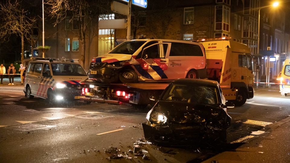UPDATE, 22 april, 11.33 uur: De politiebus reed met zwaailicht en sirene en was op weg naar een incident bij het station. De politie meldt dat van beide bestuurders een blaas- en een speekseltest is afgenomen. Daaruit bleek dat ze beiden niet onder invloed van drank en/of drugs waren. Beide auto’s zijn in beslag genomen voor verder onderzoek.