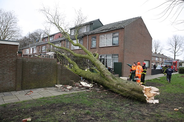 Aan de Jan Vermeerlaan in Roosendaal is een boom bezweken door de harde wind. De boom kwam terecht in vier tuinen. Ook daken en bijgebouwen raakten beschadigd. De brandweer heeft de boom klein gezaagd en de gemeente heeft alles opgeruimd.