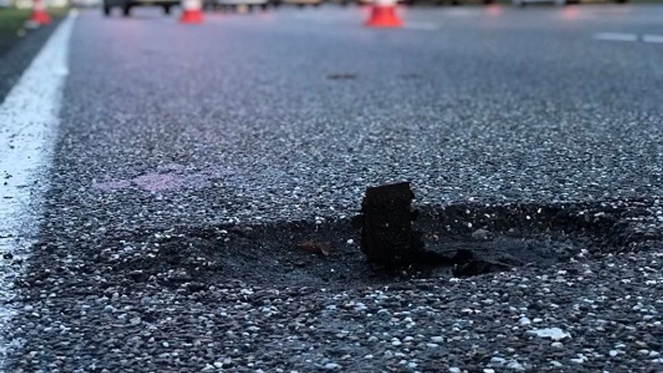 Op de N262 bij Roosendaal, vlak voor de stoplichten op de Antwerpseweg, stak woensdagmorgen een stuk ijzer door het wegdek.
