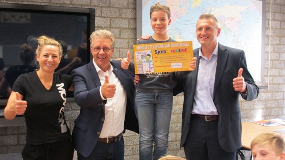 Aangemoedigd door zijn klasgenoten kreeg Nick van Nispen uit groep 7/8 van basisschool De Saffier donderdag een cheque uitgereikt door wethouder cultuur Hans Verbraak en Tini Coppens van Rabobank Zuidwest-Brabant. De tekening van Nick kwam als mooiste tekening van Roosendaal uit de bus en prijkt nu op de voorkant van zo’n zevenduizend Sjors Creatief boekjes.