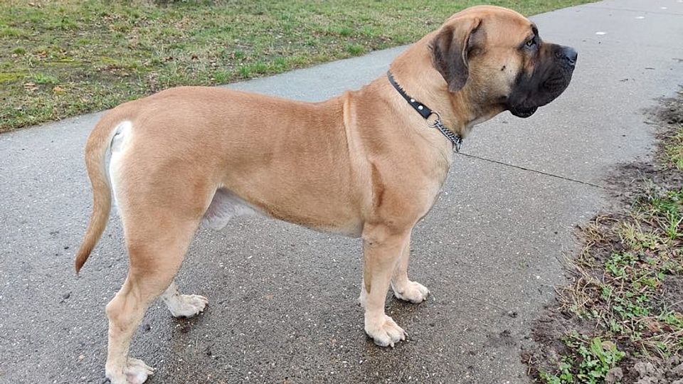 Al sinds september verblijft Konan, een Boerboel van bijna twee jaar oud, bij Theo. “Ik train hem en help hem minder angstig te worden. Zijn eigenaren konden hem vorig jaar niet meer handelen, dus toen is Konan bij mij gekomen. Hij is in die maanden gigantisch gegroeid. Niet zo gek, want ik maak lange wandelingen met hem. Een prachtig beest.”