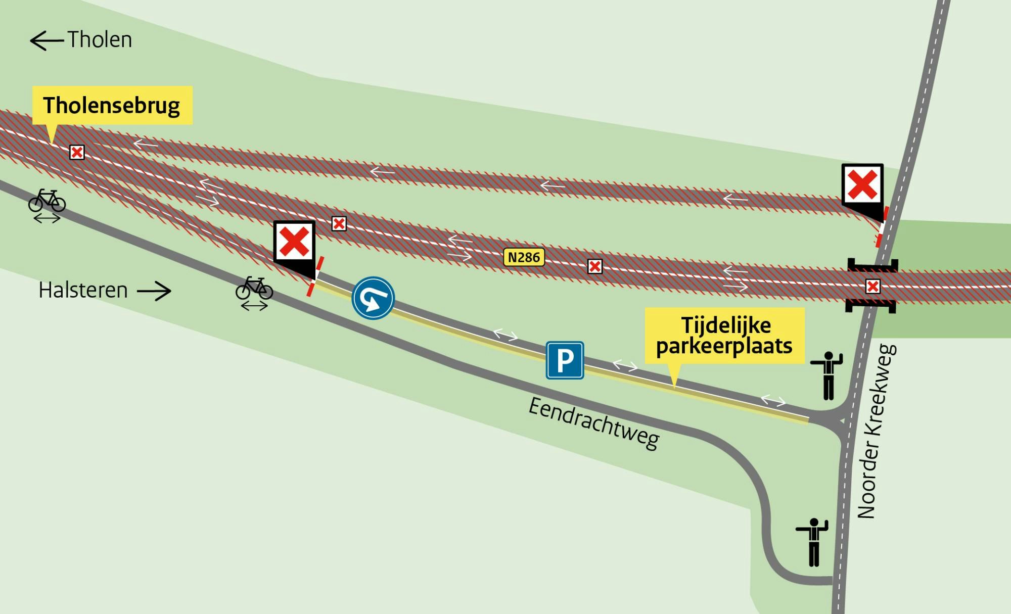 Voor woon-werkreizigers heeft Rijkswaterstaat sinds deze week een tijdelijke parkeerplaats ingericht aan de Halsterse zijde van de Tholense Brug, ter hoogte van de Noorderkreekweg. Bij de afrit kunnen automobilisten die in Tholen-stad wonen maar elders werken, hun auto’s parkeren – en vandaaruit met de fiets heen en weer naar huis gaan.