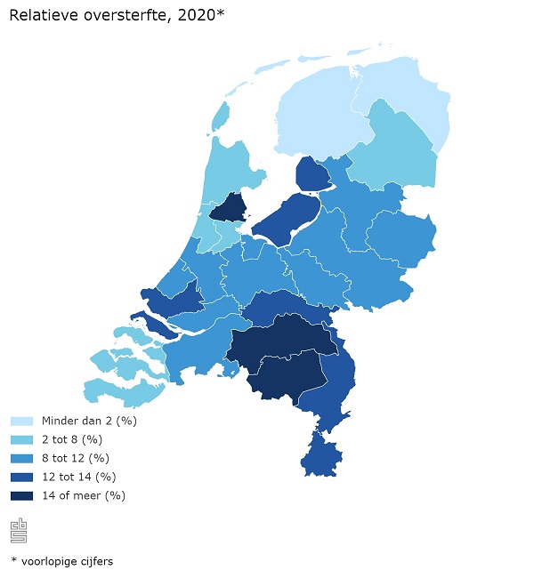 “De sterfte was vooral hoog in het voorjaar, tijdens de eerste golf van de corona-epidemie. Maar ook tijdens de hittegolf en de tweede golf van de corona-epidemie stierven meer mensen dan verwacht,” aldus het CBS. De eerste golf van de coronapandemie zorgde voor veel sterfgevallen in het zuidoosten van Nederland, waar de eerste uitbraken waren. De tweede golf, in het najaar, was meer verspreid over Nederland.