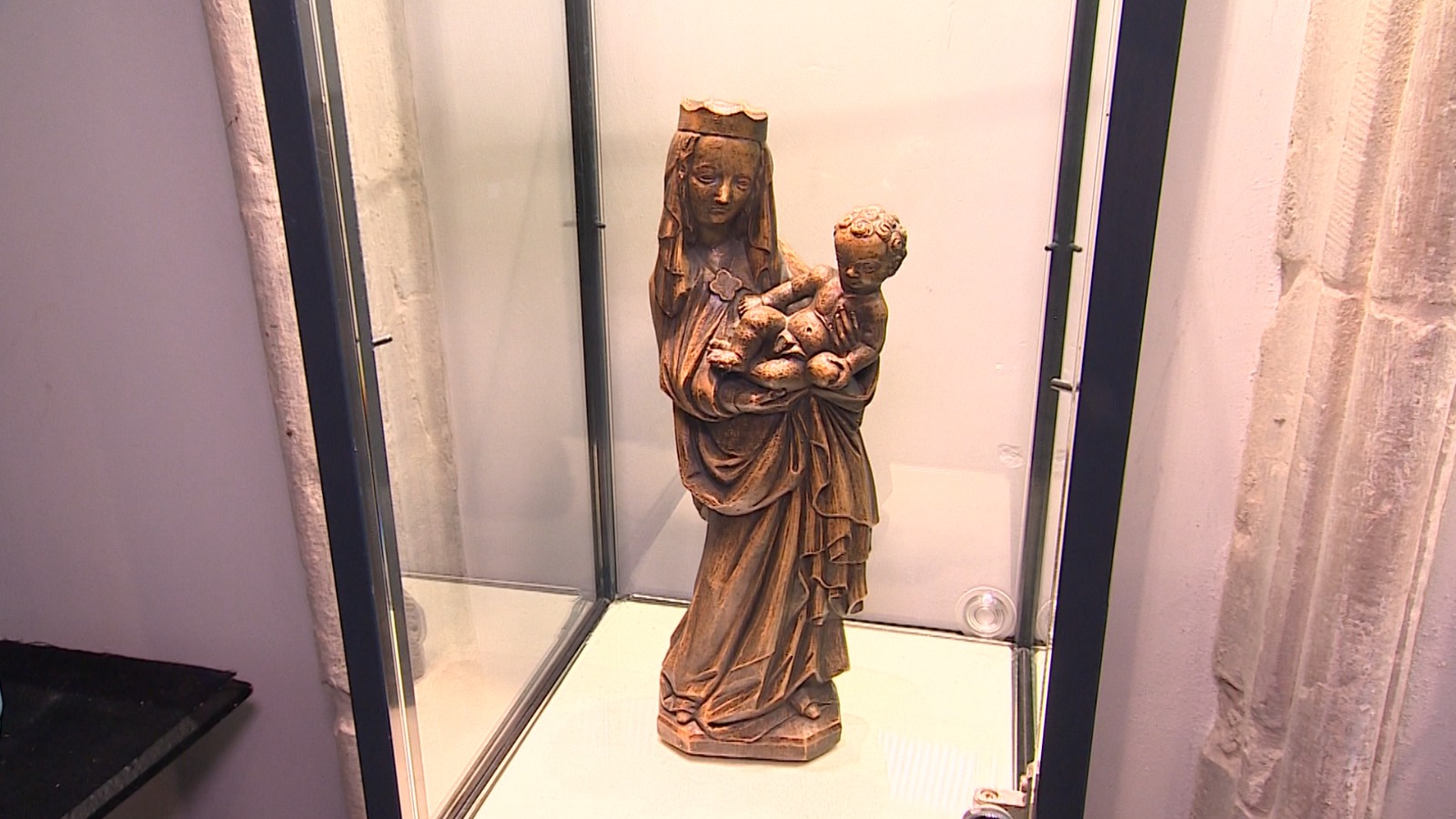 Een stukje verder staat in een verlichte vitrine een houten Mariabeeld. “Ze wordt ook wel Rijnlandse Madonna genoemd. Dat heeft te maken met haar houding”, gaat de pastoor verder. Ook hier heeft Maria het kindje Jezus vast, deze ligt op haar arm.