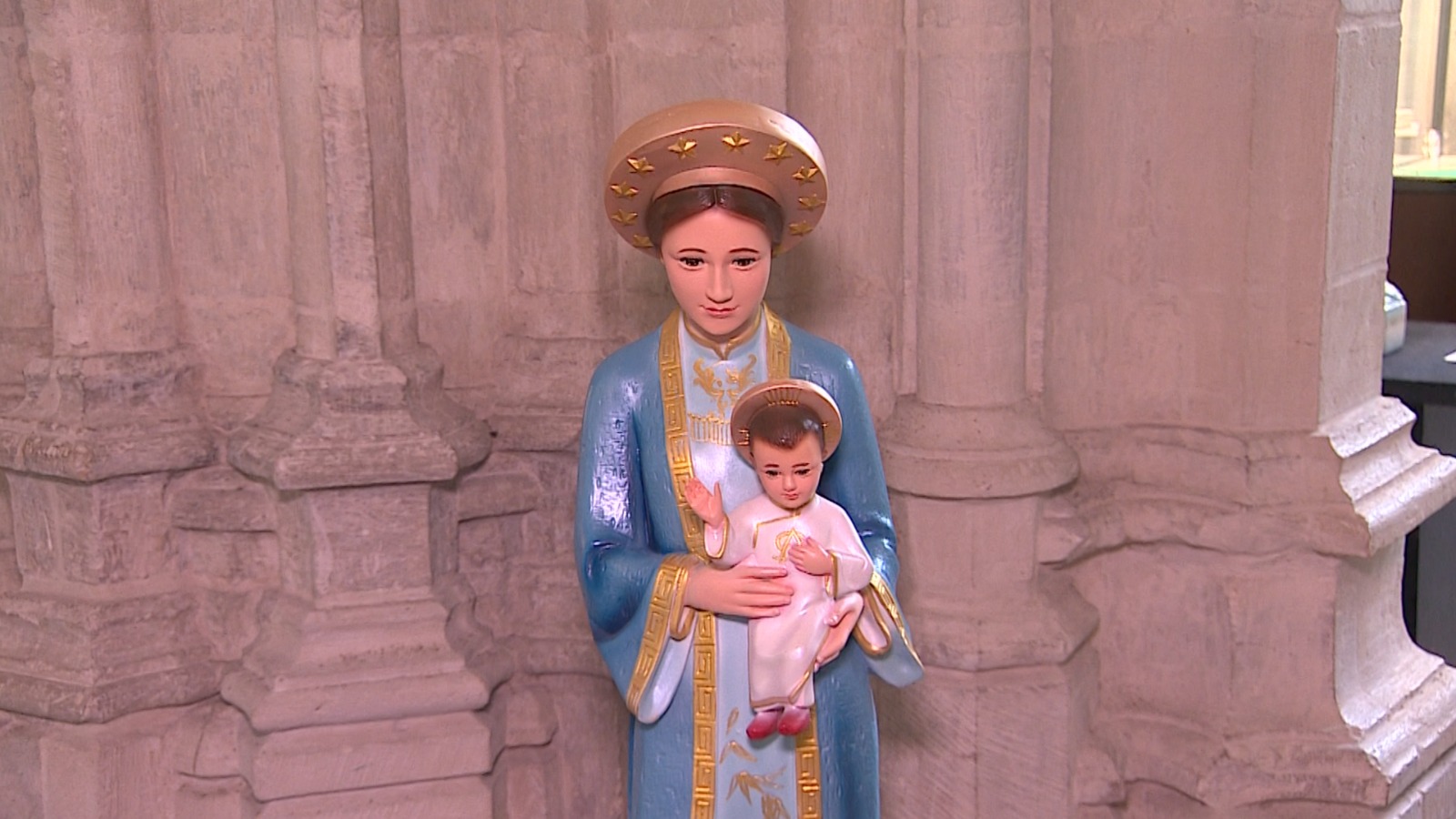 Pastoor Verbeek wijst een Mariabeeld aan. “Onze Lieve Vrouw van Vietnam”, legt hij uit. “Bijzonder is dat haar kleding overeenkomt met de feestkleding die Vietnamese vrouwen ook tegenwoordig nog dragen. Zo zullen ze ook te zien zijn in de Mariaommegang.” Het pelgrimsoord in Vietnam waar dit beeld thuishoort, trekt jaarlijks duizenden pelgrims. “Veel mensen vinden in Vietnam steun bij deze beeltenis van Maria met het kindje Jezus op haar schoot.”