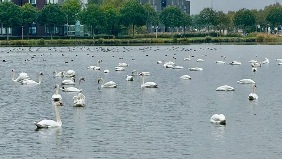 “Wij noemen het hier de zwanenconferentie”, zegt een bewoner van een appartement aan de Boulevard. “Je moet alleen niet te dicht bij ze in de buurt komen, want dan worden ze boos. Maar gelukkig zwemmen ze een stuk van de kant af en vallen ze niemand lastig. Daar hebben ze ook geen tijd voor, want ze zijn voortdurend aan het eten.”