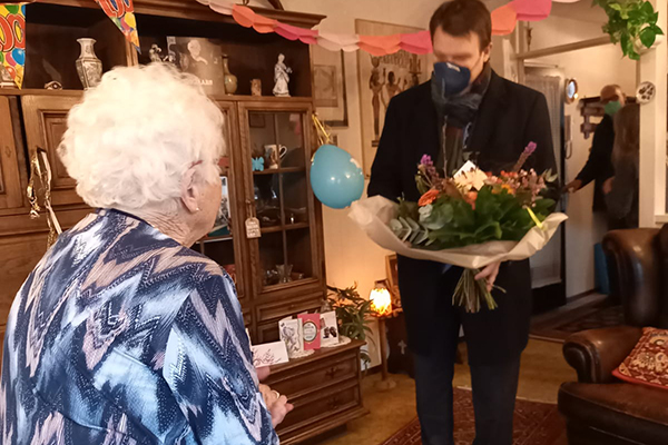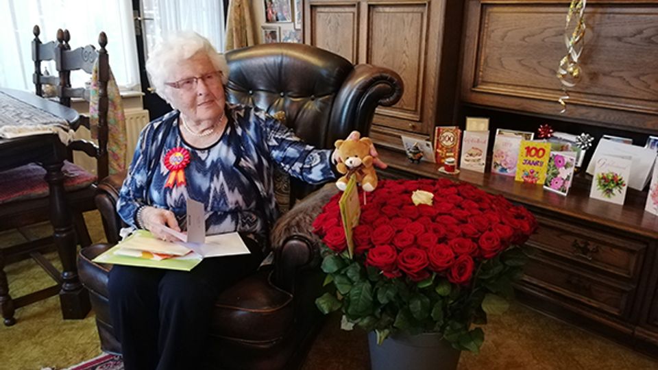 To Hagens-Beijaarts uit Wouw is donderdag 100 jaar geworden. Burgemeester Han van Midden is haar persoonlijk gaan feliciteren. Op gepaste corona-afstand natuurlijk.