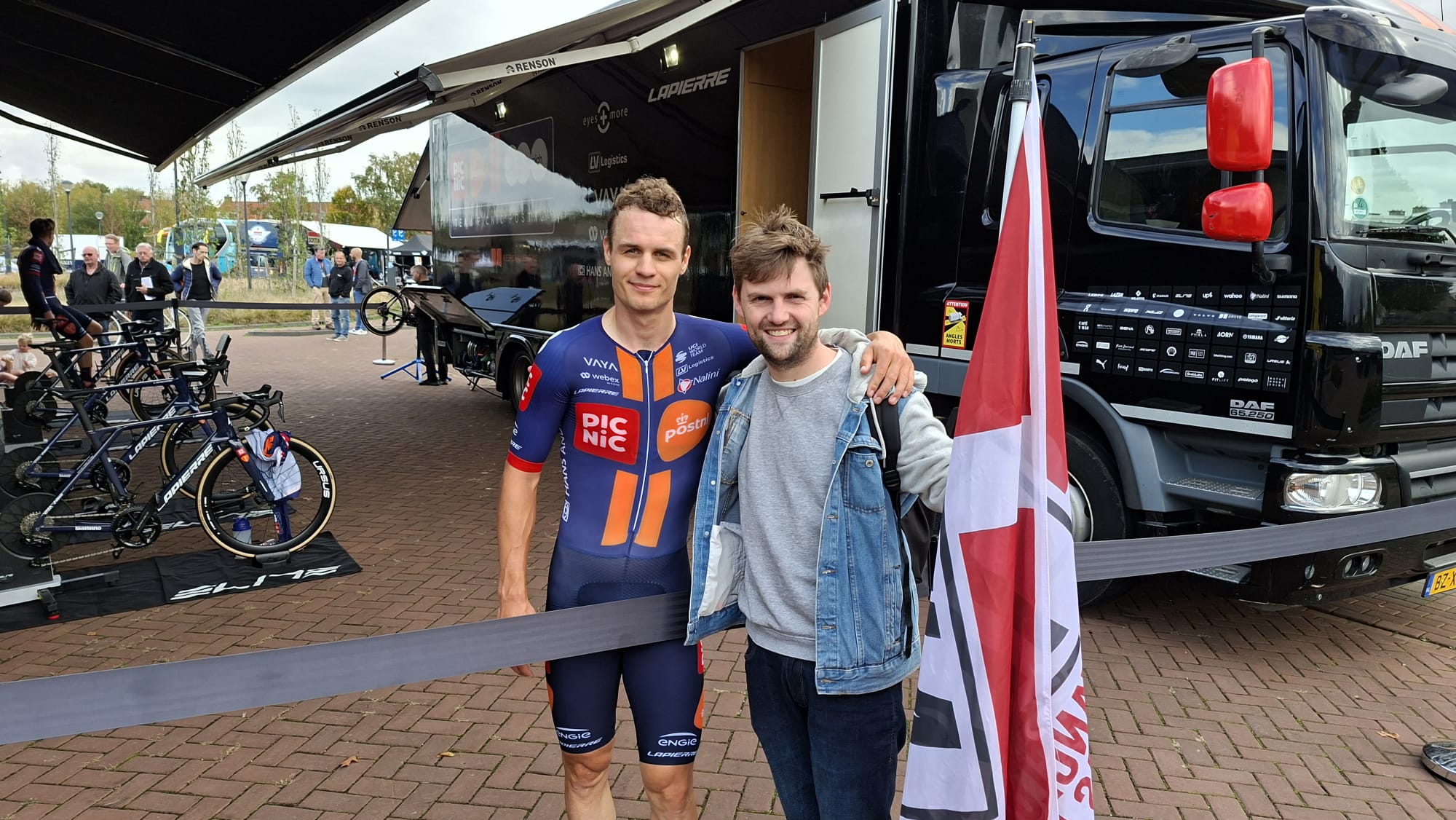 De renner van Team Picnic PostNL, dit jaar nog derde in een etappe in de Tour de France, zit rustig uit te fietsen na de tijdrit en maakt tijd voor een praatje met Jochim. Deze vriendelijke Belg draagt een enorme Deense vlag bij zich met de tekst ‘Tobias Lund Andresen Fanclub’. “Twee jaar geleden ben ik met de fanclub begonnen. Ik woon twee uurtjes hier vandaan en als Tobias in de buurt fietst, kom ik altijd wel even kijken. Dan maken wij even een kort praatje”, vertelt hij.