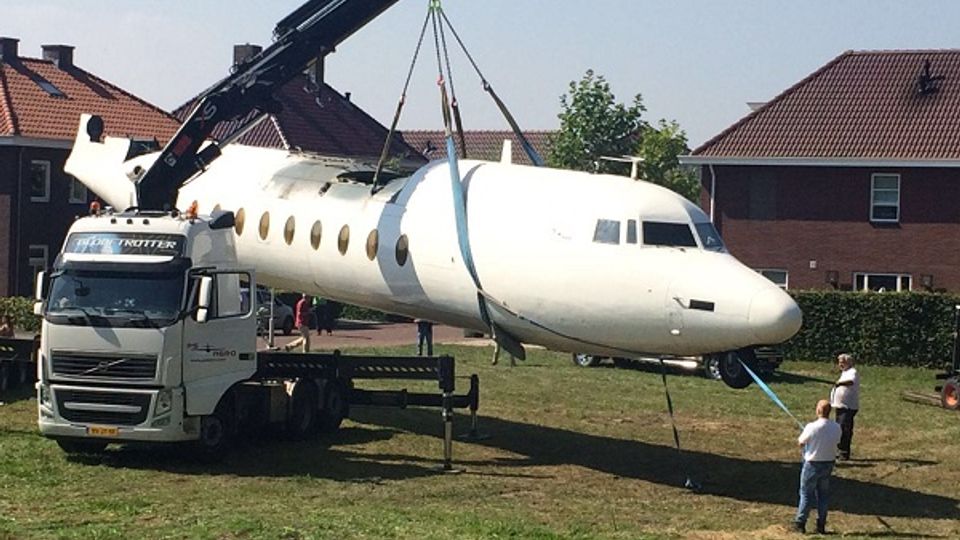 Het Fokker F27 vliegtuig dat bij de bed & breakfast komt aan de Nijverheidsstraat in Hoogerheide is woensdag onder veel publieke belangstelling gearriveerd.
