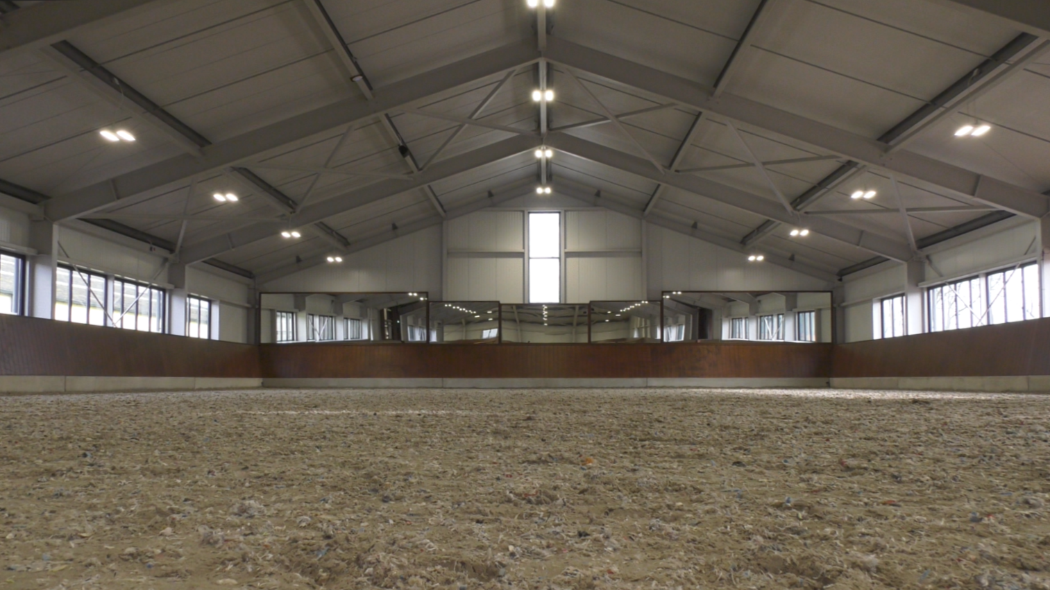 Haar man is in een buitenpiste vlakbij aan het rijden. “Kom het anders even laten zien”, roept ze naar hem. Zonder moeite stuurt hij zijn paard naar boven, de ruime hallen in. “We hebben een hal van 20 bij 60 meter, en een hal van 25 bij 65 meter”, legt Dominique uit. “De afmetingen 20 bij 60 meter zijn de afmetingen voor een wedstrijdpiste. We hebben er eentje groter gemaakt, zodat er ook springwedstrijden in gehouden kunnen worden.” Ook weer bijzonder hier zijn de juryhokjes die in de wand van de rijhal zijn gemaakt. “Op die manier gebruiken we onze ruimte zo optimaal mogelijk.”