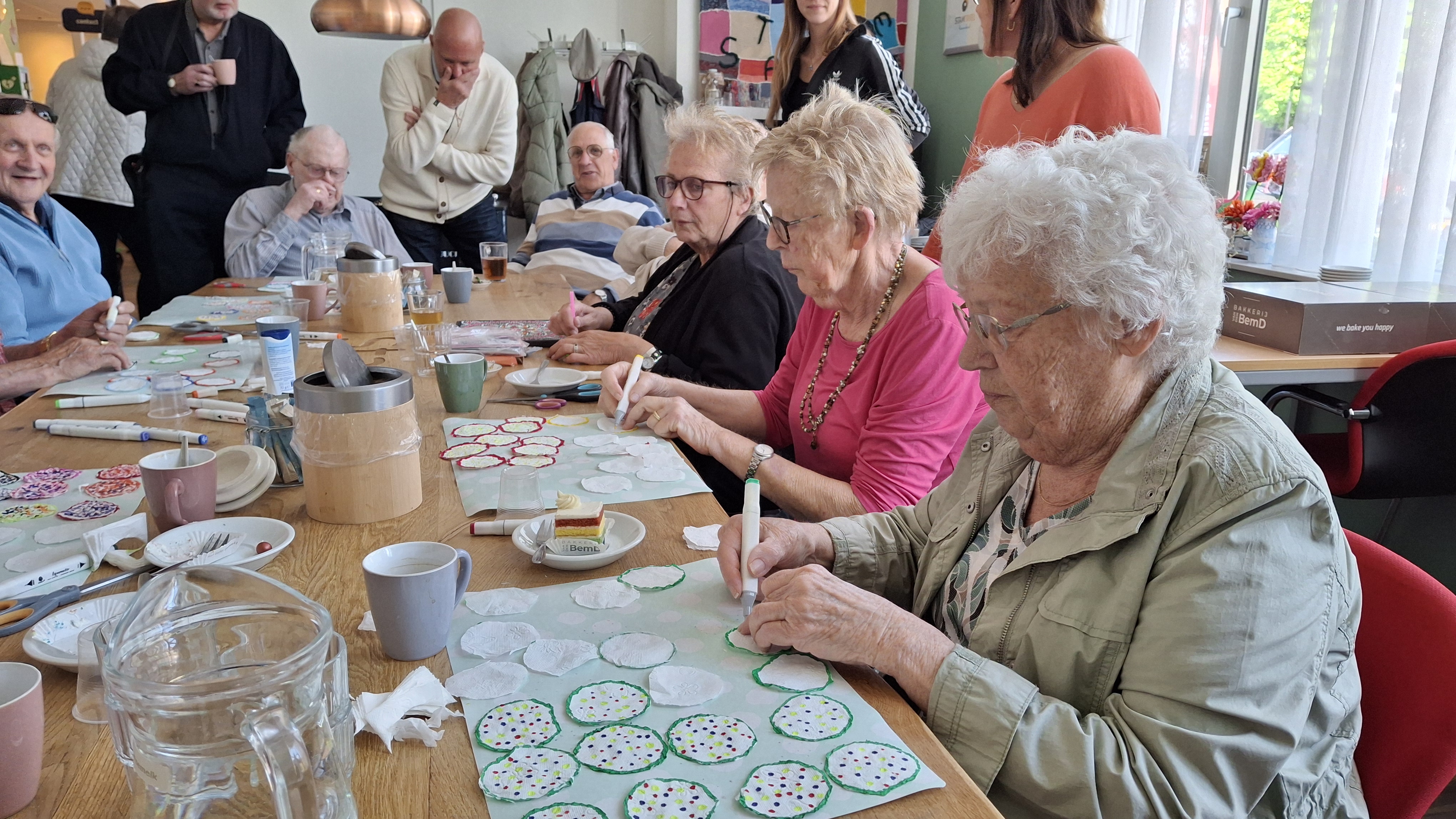 Het is daarom van belang dat mensen ergens terecht kunnen met vragen over zorg of ziekte bij hun partner. Maar het is ook gewoon voor de gezelligheid en elkaar ontmoeten. “Ervaring is dat ontmoeting als sleutel gebruikt kan worden om eenzaamheid tegen te gaan”, vertelt Van Rijen. Dat geld ook voor Annie Bogers. Zij komt al een lange tijd bij de stamtafel. “Voor de gezelligheid en lekker onder de mensen. “Thuis zit ik maar alleen”, zegt ze. Ze is dit keer met de groep bezig met het knutselen van bloemen.