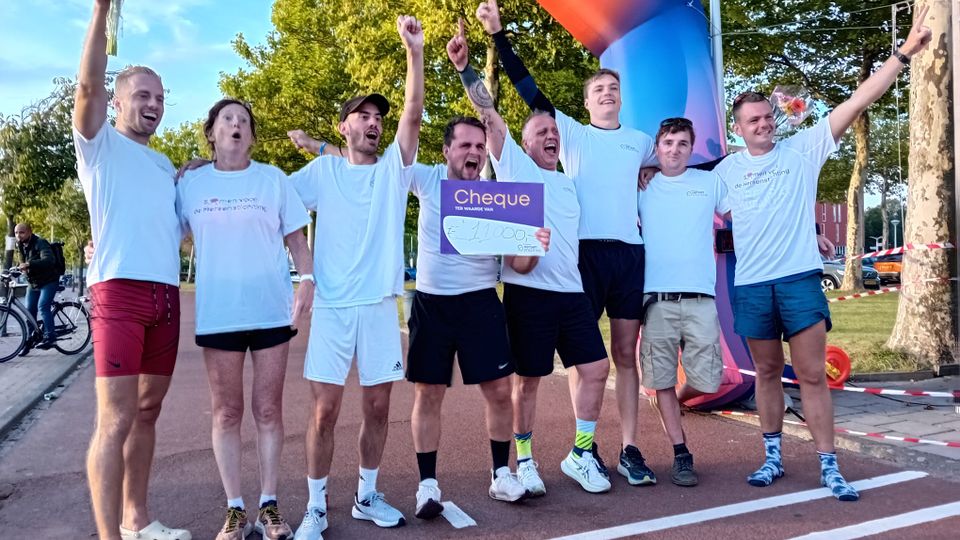 Dan is het tijd om de cheque te overhandigen aan de Hersenstichting. Maar niet voordat Johnny de atleten heeft bedankt. En dan overhandigt hij het symbolische waardepapier met daarop een bedrag van 11 duizend euro.