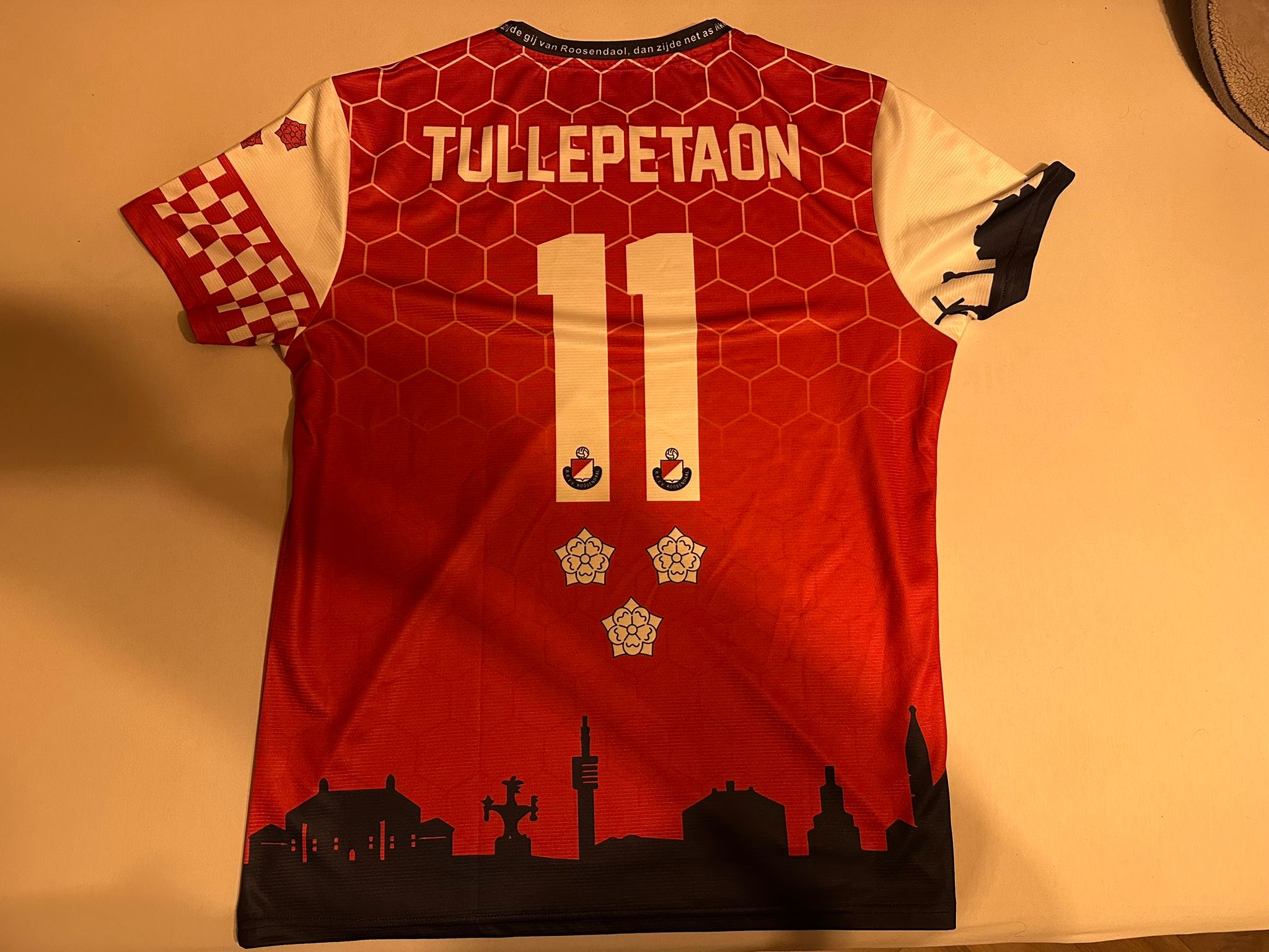 Ook is de Brabantse vlag terug te vinden op de plek waar normaal de aanvoerdersband zit. Achterop het shirt staat als ‘spelersnaam’ het woord Tullepetaon met natuurlijk rugnummer 11. Als laatste detail is in de kraag van het shirt een slogan verwerkt. “Die slogan is: ‘Dan zijde gij van Roosendaol, dan zijde net als ikke’. Dat is een bekende carnavalsslogan in de stad en slaat ook op onze vereniging”, zo verklaart Volkan.