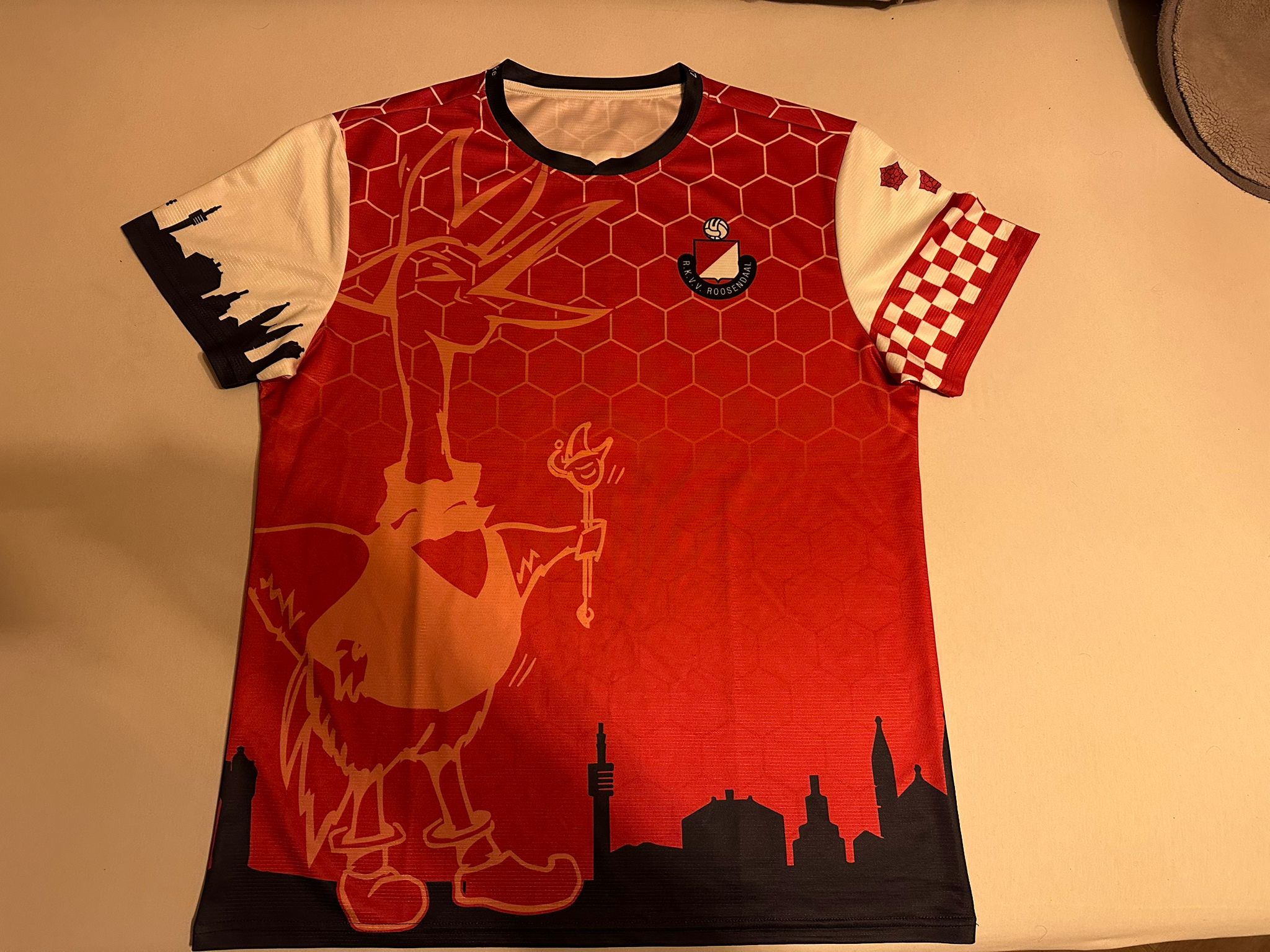 Op het shirt zijn de kleuren rood en wit terug te vinden, de kleuren van zowel de stad Roosendaal als van de plaatselijke RKVV. Uiteraard prijkt voorop het shirt de grote Tullepetaon, bij uitstek hét carnavalsembleem van de stad. “Op de mouw en onderop het shirt is de skyline van Roosendaal te zien”, gaat Volkan verder met de uitleg.