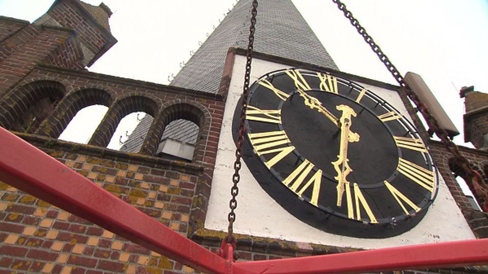 De uurwerken en wijzerplaten van de kerktoren in Hoogerheide krijgen een flinke opknapbeurt. Met een grote hijskraan werden woensdagochtend de uurwerken van de kerktoren gehaald.