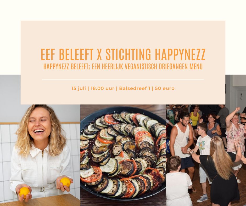 Eef Beleeft kookt vegan, dus zonder dierlijke producten. Voor 50 euro mag je aanschuiven en krijg je drie gangen met verrassende gerechten. “We beginnen bijvoorbeeld met een tomatencrèmesoep met crème van cashews. En daarna komen er meerdere gerechten op tafel, waar je gezamenlijk van mag pakken. Het liefst zo veel mogelijk van lokale producten gemaakt,” legt Matthijsse uit. “Zoals ratatouille en een aubergine cannelloni. Maar het is deels afhankelijk van wat er bij Franken in de tuin staat.”