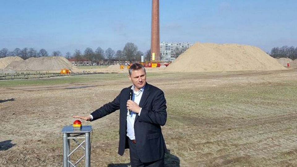 Wethouder Toine Theunis heeft zondagmorgen met een druk op knop de verplaatsing van de oude fabrieksschoorsteen van Philips Roosendaal in gang gezet.