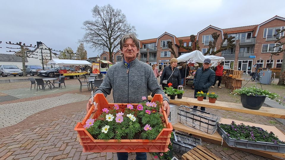 Peter Geers met een krat vol perkgoed op de boerenmarkt.