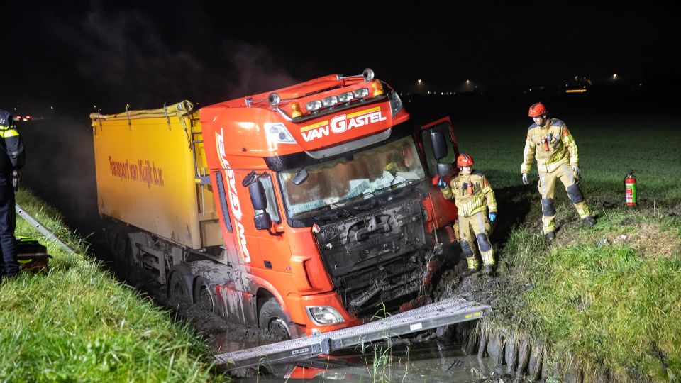 Een vrachtwagen is in de nacht van donderdag op vrijdag van de weg geraakt op de N268 bij Oud Gastel. Door onbekende reden belandde de vrachtwagen, met lege trailer, in een sloot.