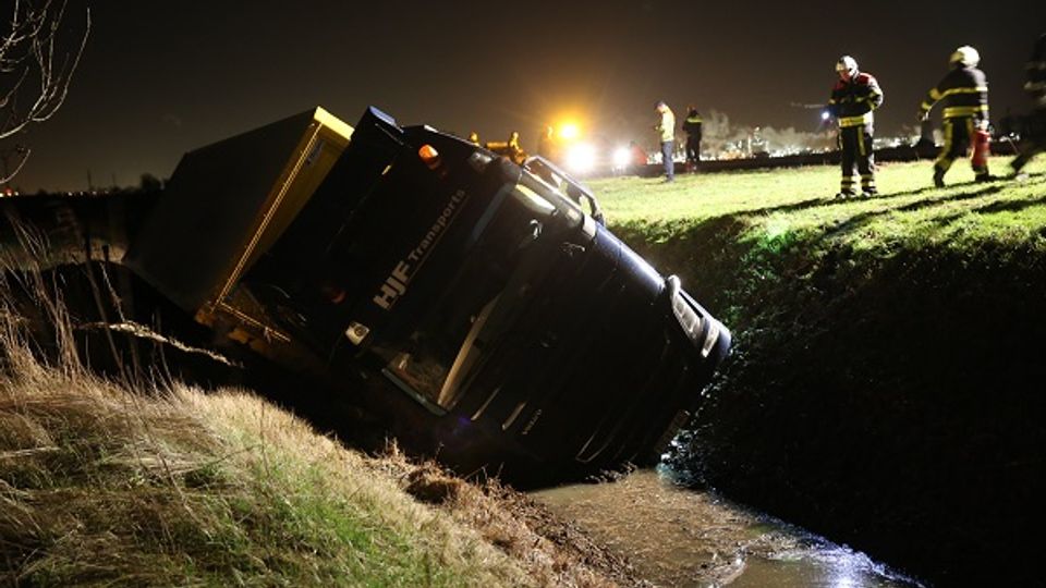 Een vrachtwagenchauffeur is maandagnacht met zijn vrachtwagen in de sloot beland op de A4 bij Woensdrecht.