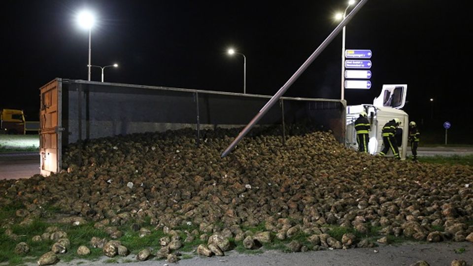 Een vrachtwagen vol met suikerbieten is zondagavond gekanteld op een rotonde aan de N268 tussen Stampersgat en Dinteloord.