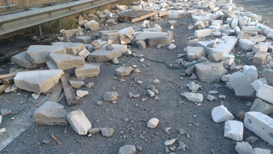 Vrachtwagen verliest betonblokken: verkeer muurvast