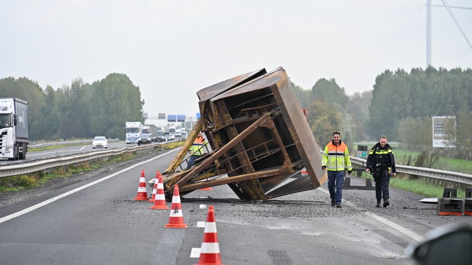 Vrachtwagen verliest grijpbak op A17, viaduct en wegdek beschadigd