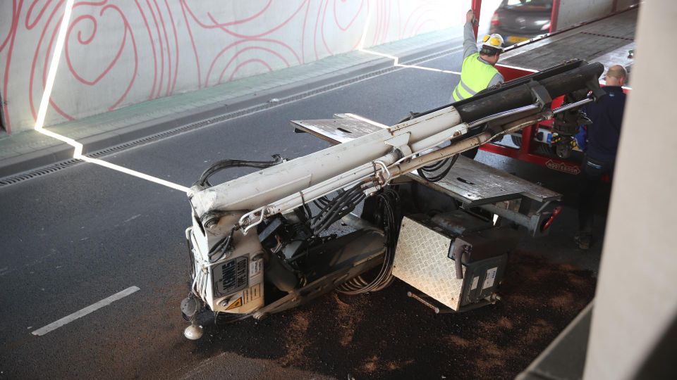 Het incident vond ’s ochtends plaats bij de Markttunnel. De vrachtwagen wilde erin rijden en dat bleek niet te passen. De kraan op het voertuig bleef steken en kwam op het wegdek terecht. Het viaduct raakte beschadigd en er moest een bergingsbedrijf aan te pas komen om de kraan van de weg te halen. Daarvoor is tijdelijk één rijstrook van de weg afgezet.