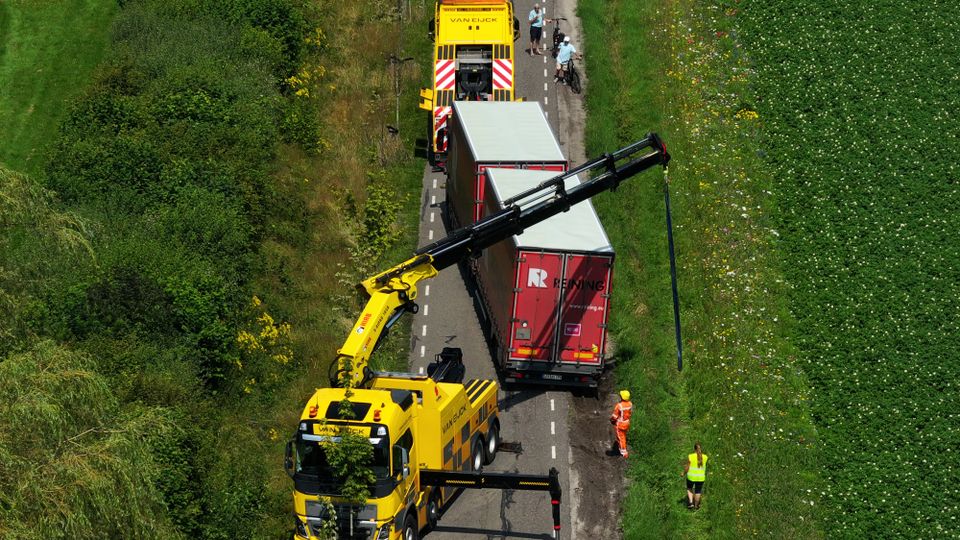 Een vrachtwagen raakte vrijdagmorgen rond 8.30 uur vast in een greppel langs de Zoomvlietweg bij Bergen op Zoom. Het voertuig moest uitwijken, en daardoor zakte het achterste deel van de combinatie zo ver in de greppel dat deze er niet meer uit kwam.