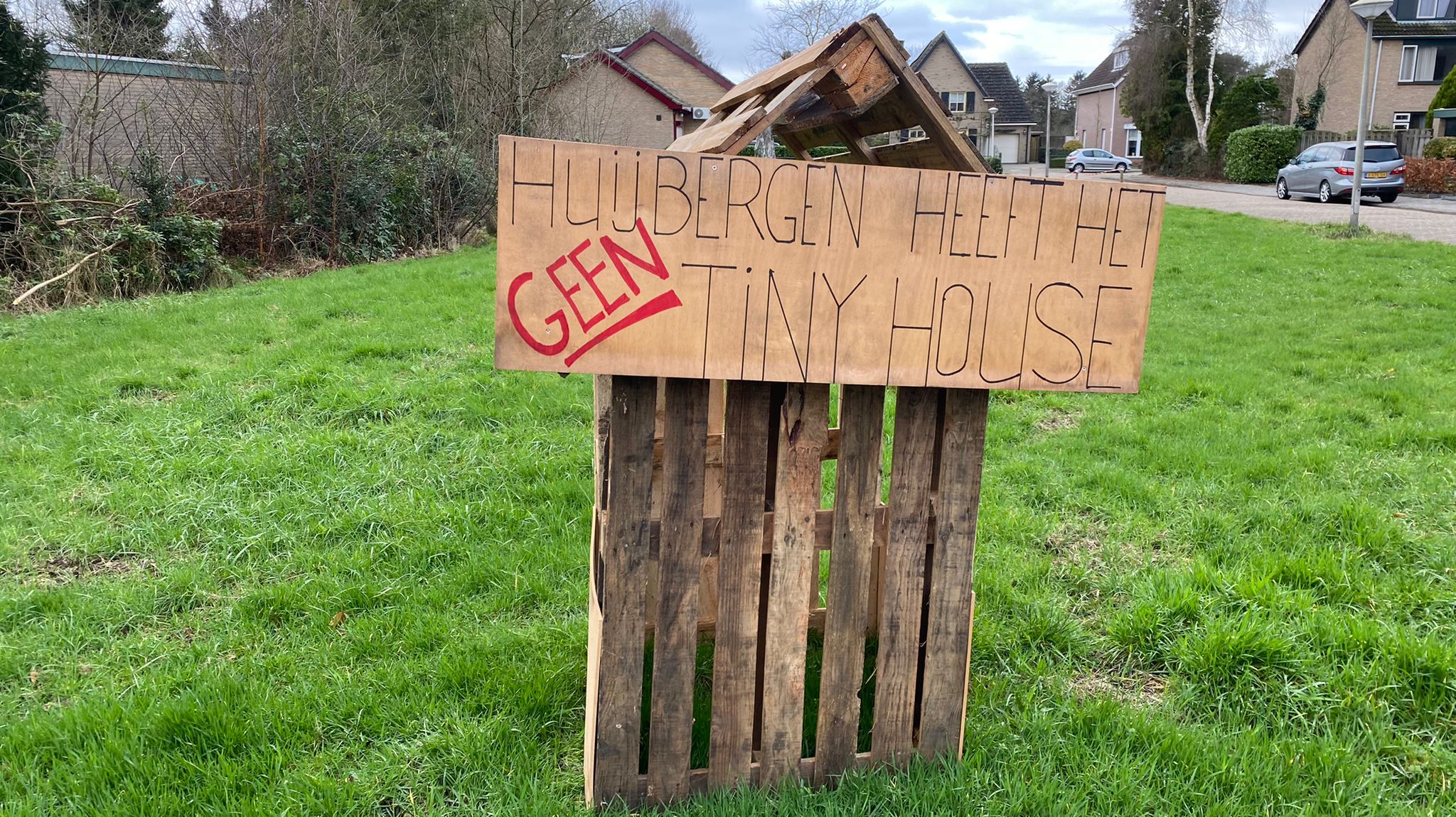 Zo ontstond het plan om op ludieke wijze aandacht voor het probleem te vragen. “Je weet hoe dat gaat. Gezellig met wat vrienden onder elkaar, biertje erbij. Maar we wilden absoluut niks kapotmaken. Dus bijvoorbeeld ook geen stickers, die je vervolgens nergens meer fatsoenlijk vanaf krijgt. Toen bedachten we om dan maar onze eigen tiny houses te maken van wat pallets. Die hebben we vervolgens met een aanhangertje één voor één op hun plek in het dorp gezet.”