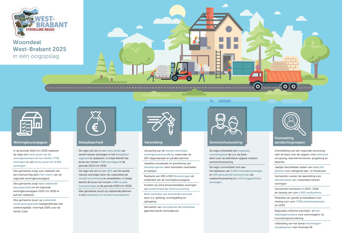 Als eerste stedelijke regio in Noord-Brabant heeft West-Brabant de Woondeal geactualiseerd. Concreet houdt dat in dat er de komende vijf jaar nog eens ruim 1800 extra woningen in de regio bijgebouwd gaan worden om aan de woonbehoefte te voldoen. Daarnaast zullen enkele projecten versneld uitgevoerd gaan worden.