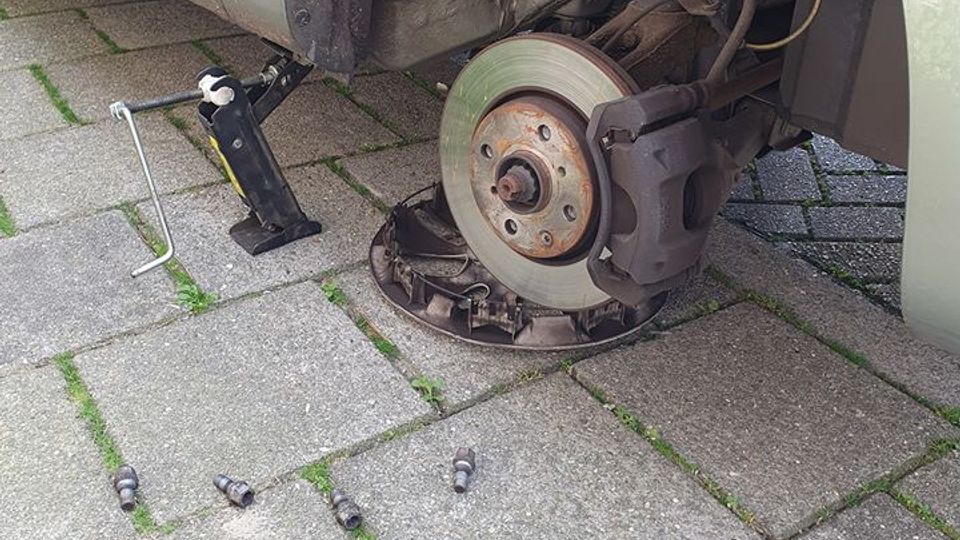 Joost en Anouk van de Graaf uit Halsteren kregen zondag een nare verrassing. Ze ontdekten dat het wiel onder hun auto was verdwenen. De dief of dieven hadden ook bij de buren geprobeerd een autowiel te stelen.