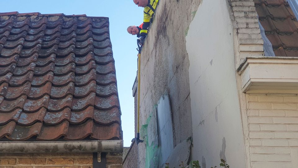 Het gaat om een woning in de Korte Dubbelstraat te Bergen op Zoom. Daar waaide aan het einde van zondagmiddag stucwerk van de zijgevel. Het nog loszittende deel is door de brandweer verwijderd om te voorkomen dat ook dit ging vallen.