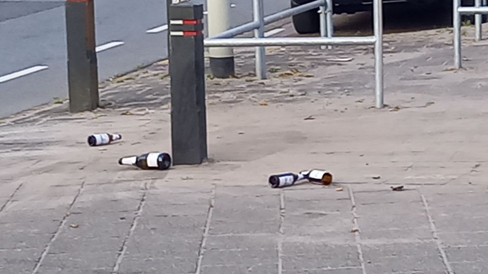 Een bewoner fotografeerde een deel van de op straat gegooide bierflessen.