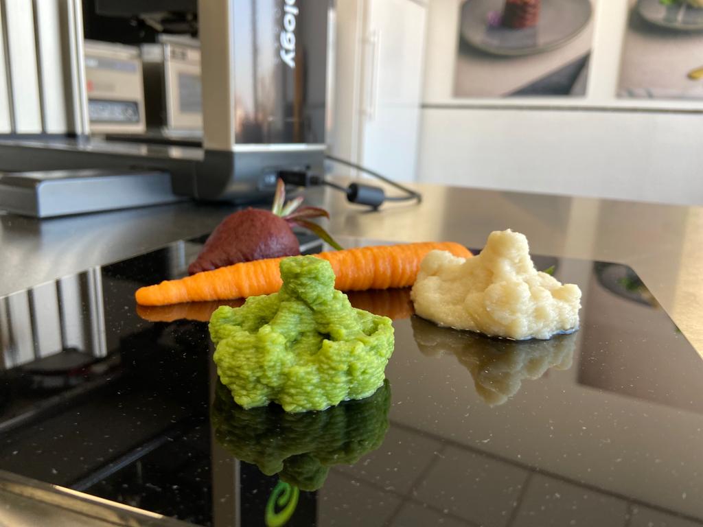 De broccoli, bloemkool en worteltjes in het laboratorium van Gastronology 3D Foods in Bergen op Zoom zijn niet van echt te onderscheiden. Maar schijn bedriegt want deze groentes zijn allemaal met een lepel te eten. Daarvoor zijn ze eerst gekookt en daarna terug geprint in de vorm van de betreffende groente.