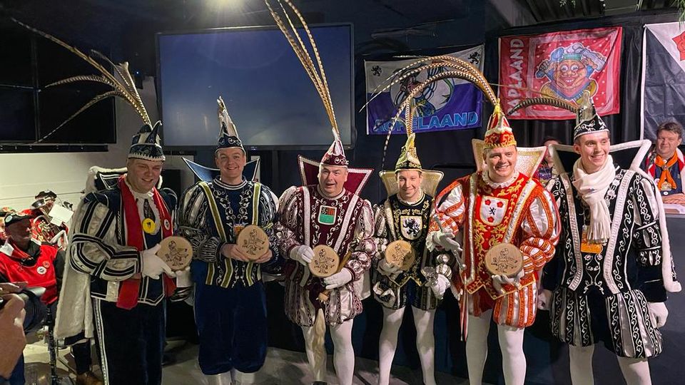 V.l.n.r: Prins Ralph, Prins Rikus, Prins Eduward, Prins Nicotino, Priens Wiebe en Prins Stijn die zijn collega's net een kado heeft gegeven omdat ze 'uit ut goeie out zijn gesneje'. Foto: Paul Joachems