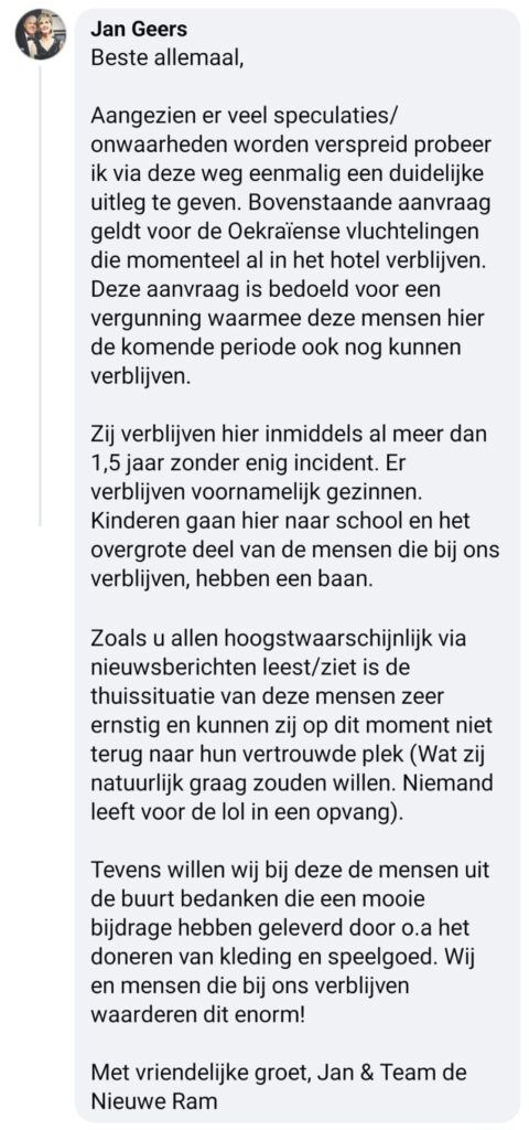 Wat ooit in maart vorig jaar is gepresenteerd als een luxe hotelplan met een “wow-gehalte”, lijkt nu vooral een bron van verdeeldheid te zijn. Initiatiefnemer Jan Geers vangt al sinds eind 2023 zo’n 65 Oekraïense vluchtelingen op in het hotel aan de Steenbergseweg, en wil die opvang voortzetten. De mensen verblijven daar al anderhalf jaar en er is nog nooit iets voorgevallen, reageert hij op social media (zie screenshot onder dit artikel). Hij zou geen plannen hebben om hier andere doelgroepen op te vangen.