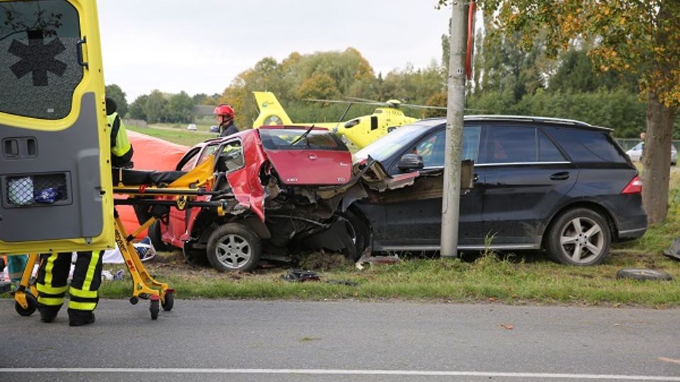 Een traumahelikopter, ambulance en een brandweerauto waren ter plaatse. De bestuurder van de 45 km auto is met de ambulance en de trauma-arts naar het ziekenhuis gebracht.