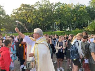· "Het gaat niet om de stenen, maar om jullie," roept de rector. Een aantal leerlingen houden hun rugzak boven het hoofd, ter bescherming tegen het wijwater.