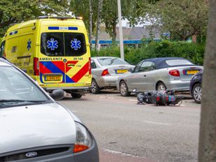 · De scooterrijder reed vermoedelijk achterop een auto, en viel vervolgens tegen een geparkeerde auto aan.