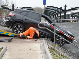 · Een bijzonder tafereel bij het NS-station in Bergen op Zoom donderdagochtend. De bestuurder van een auto nam daar de trap... met de auto.