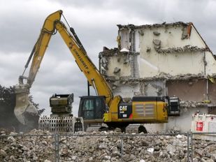 · Nog geen drie weken na de start van de sloop van wooncomplex De Leeuwerik in Halsteren, is het gebouw al geheel tegen de vlakte.
