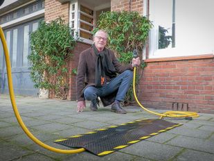· In Bergen op Zoom mogen bewoners zonder oprit hun elektrische auto via de stoep opladen met een kabelmat. Zo ziet dat eruit.