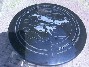 · Op de steen is een kaart te zien met de gebieden die zijn overstroomd tijdens de Watersnoodramp van 1953 in West-Brabant, Tholen en Goeree-Overflakkee.