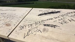 · De balustrade van de Pompejus-toren in Halsteren is beklad met stiften en graffiti. Wanneer dat precies is gebeurd, is niet…