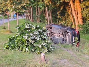 · Een auto is dinsdagavond op z'n zijkant naast de weg terecht gekomen nadat de bestuurder de macht over het stuur verloor.