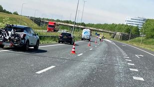 · Zowel de rechter- als de linkerrijstrook van de snelweg lag bezaaid met glas.