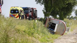 · De melkwagen belandde op zijn kant naast de dijk. De bestuurder is door de brandweer bevrijd. Hij raakte niet gewond.
